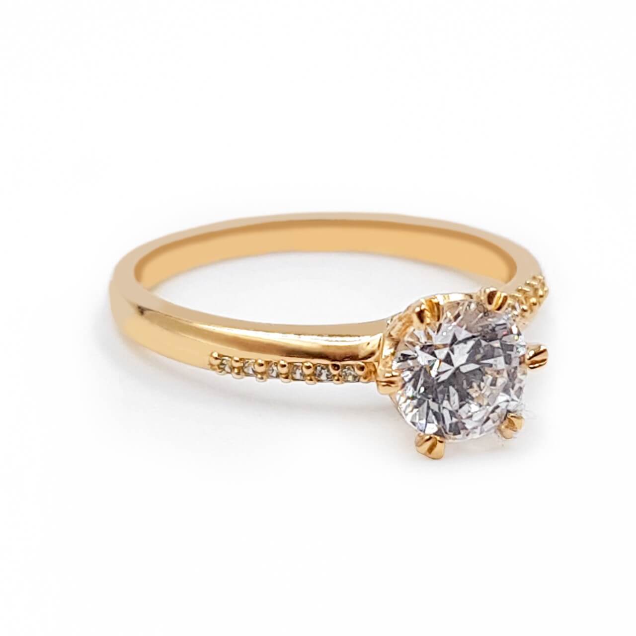 Anillo de compromiso con engaste central y micro engastes laterales de cristales. Elaborado en Oro 18K.