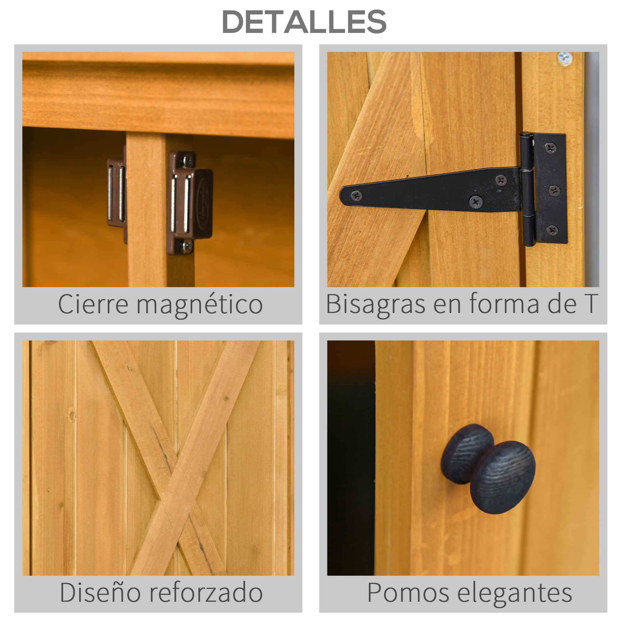 ¿Buscas un armario para organizar las cosas en tu jardín? ¡Este cobertizo de jardín de Outsunny es perfecto! Hecho con madera de abeto maciza tratada para su uso y resistencia a la intemperie y con techo inclinado asfáltico, para que el agua no se filtre al interior ni se acumule encima. Su distribución interior consta del lado izquierdo con dos estantes centrales y el lado derecho sin divisiones, permitiendo la colocación de artículos más largos. Características: Gabinete de jardín de tamaño compacto adecuado para espacios reducidos Ideal para guardar herramientas de jardinería, macetas, la manguera, etc. Mueble con estructura resistente de madera de abeto Techo con tela asfáltica para mayor resistencia a la intemperie y a la humedad Dispone de 3 compartimentos interiores en el lado izquierdo y uno más amplio en el derecho para almacenar objetos de diferentes tamaños Los pies con almohadillas de plástico elevan la base, protegiendo los objetos de la humedad del suelo Dispone de pomos para facilitar la apertura y el cierre de las puertas Las puertas cuentan con cierre magnético Requiere montaje Especificaciones: Color: madera natural Material: madera de abeto Medidas totales: 110x55x117 cm (LxANxAL) Medidas del armario: 97×46,5 cm (LxAN) Medidas de cada puerta: 46×100 cm (LxAN) Estantes: 46,4×40,5×32,4cm (LxANxAL) Compartimento derecho: 46,4×40,5×106,4cm (LxANxAL) Superficie útil: 0,45105 m² Carga máxima: 50 kg (total) y 15 kg (cada estante) Referencia: 845-324ND